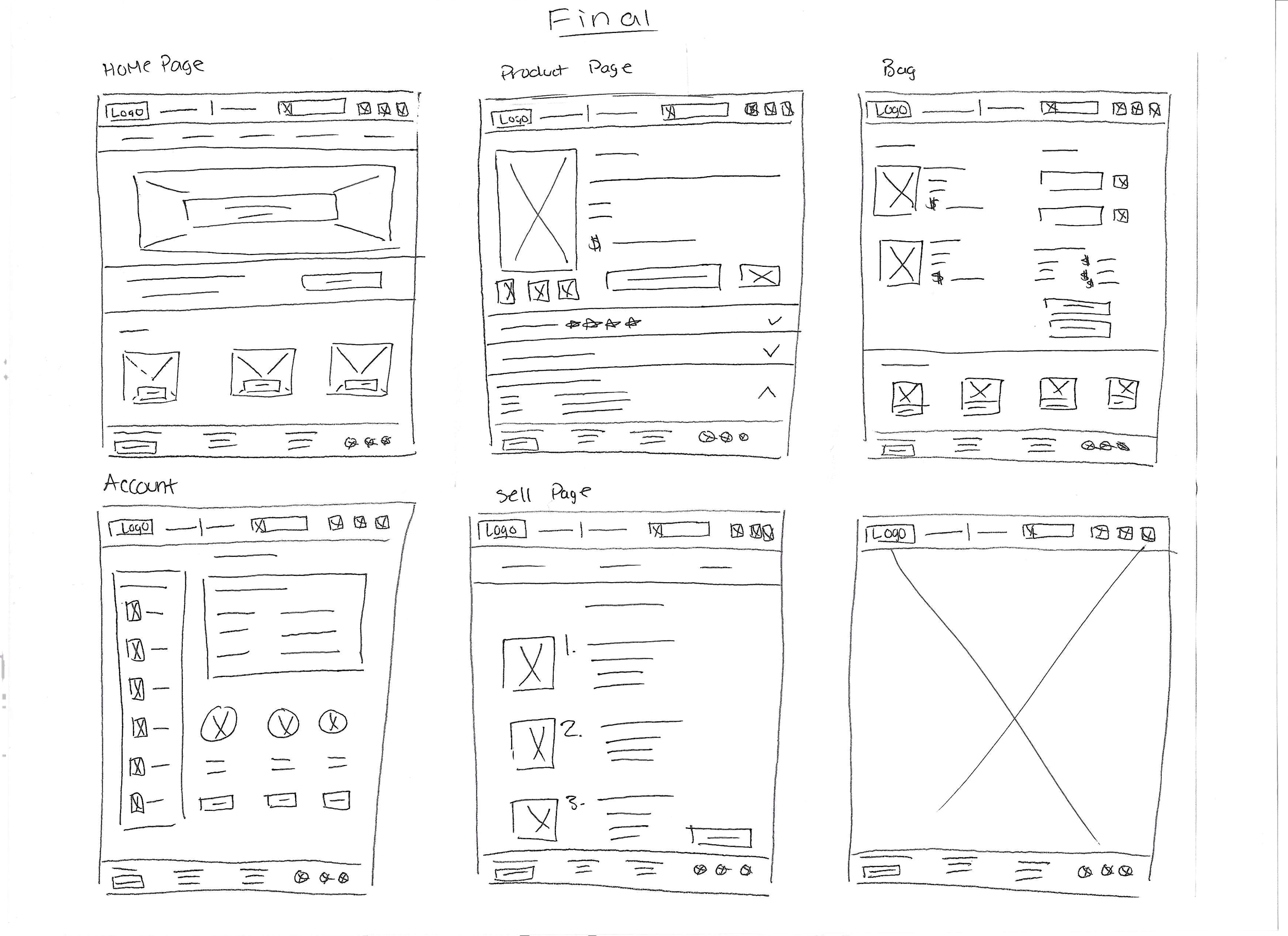 I then moved on to wireframes and started by creating five paper wireframes for each key screen of the app. This allowed me to get all my ideas out and choose the elements I liked most. I then took my favorite elements and combined them to create my final wireframe, which ended up slightly differing from my original user flow.