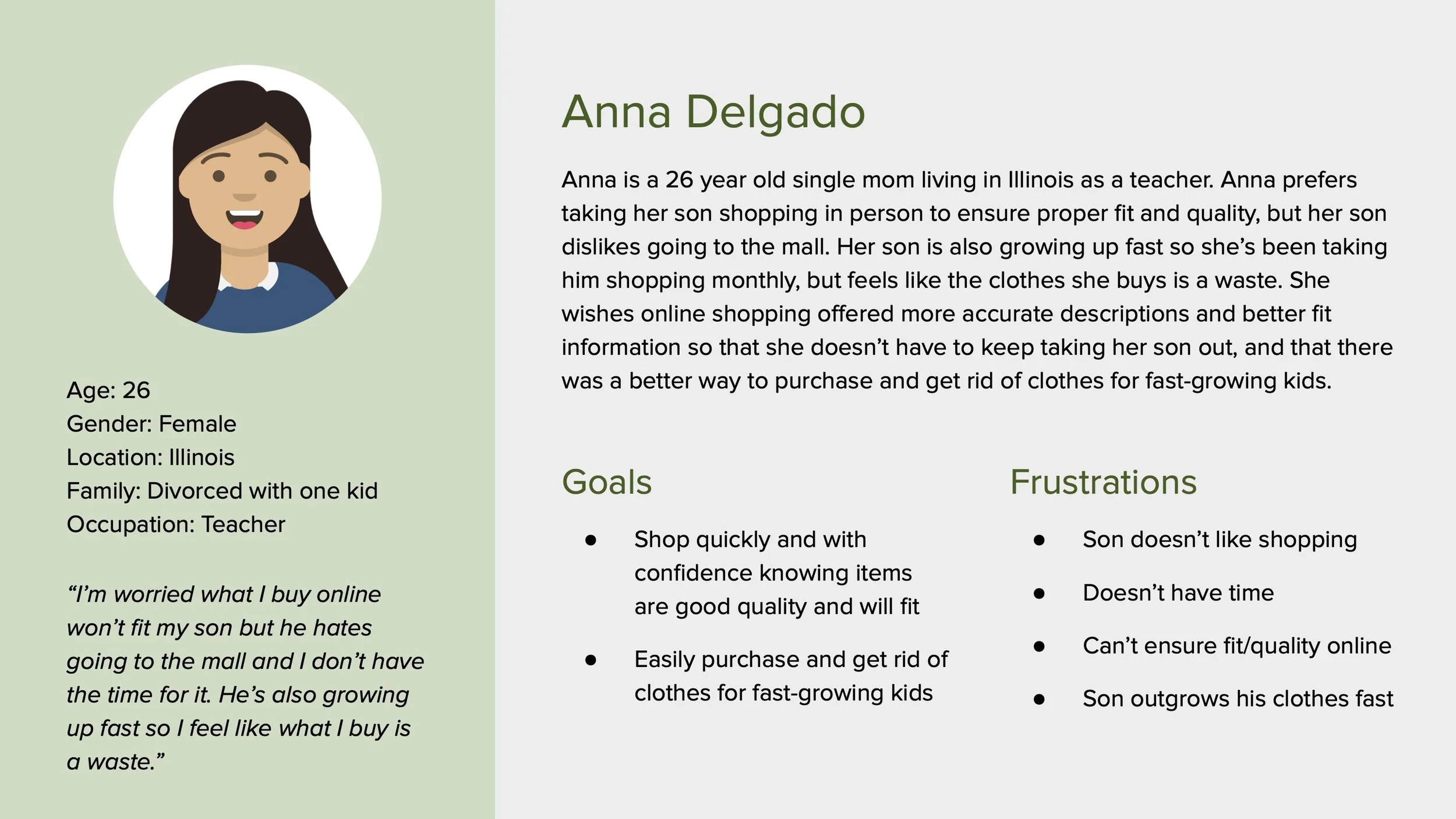 Anna is a 26 year old busy single mom of one who prefers taking her fast-growing son shopping in person, despite her limited time and his reluctance. Seeking convenience, Anna needs an app or website that offers accurate size and quality information, along with seamless options for selling or donating clothes she purchases. Anna wants to shop quickly yet confidently without the hassle of mall visits and ensure her son's wardrobe stays up-to-date without waste.